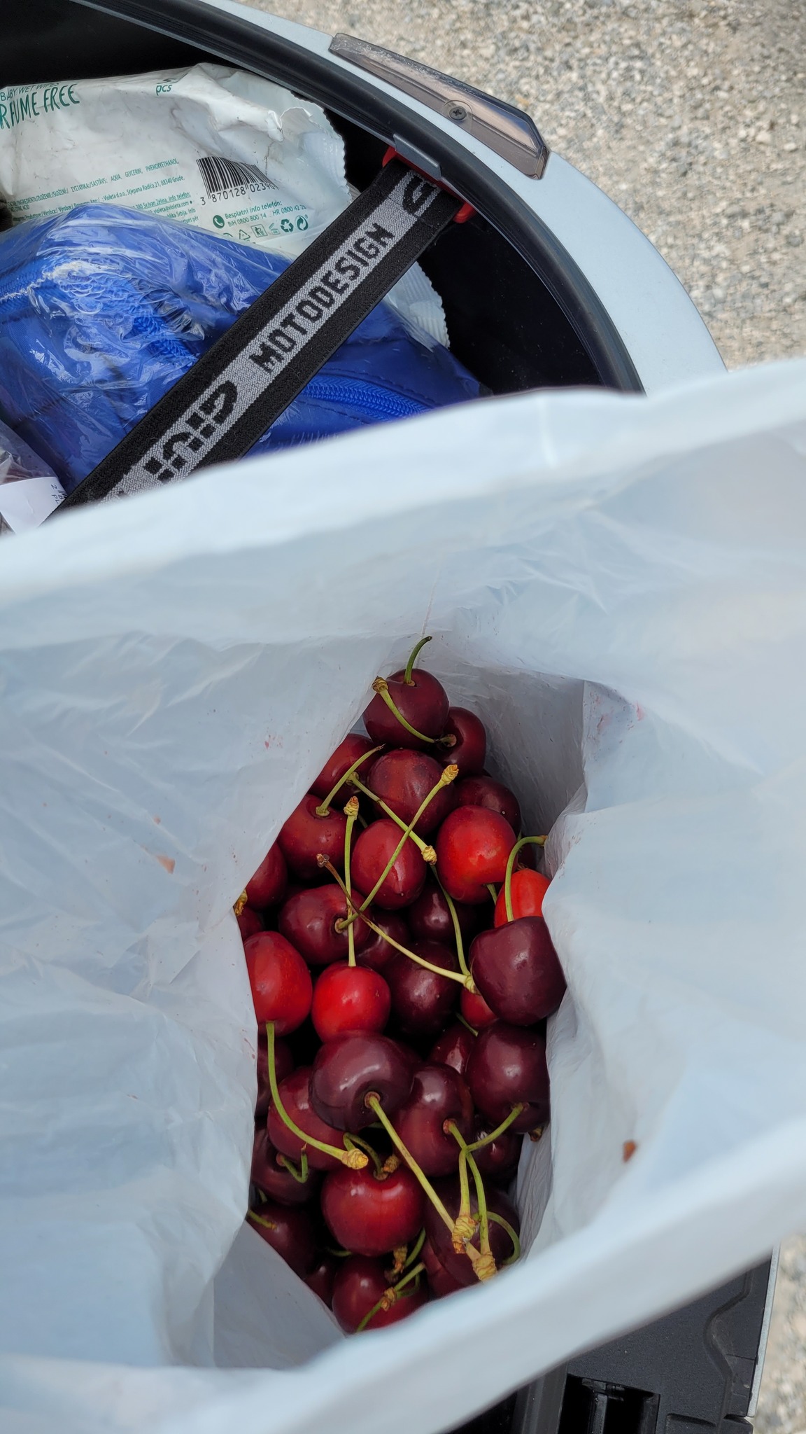 Danes so se mi "zaluštale" ride na Strmi Rebri. Ne bodi len in motor pod rit na ovinke. Glej ga zlomka, ko sem že v Kočevju, pa se ženi doma "zaluštajo" Briške češnje. Ker ji jih že 2 dni obljubljam naredim obvoz iz Medvedjih rid direktno v Goriška Brda. Naredim en krog po Brdih, če jih kje prodajajo. Stojnic ni, tako da se naključno ustavim pri nekem gospodu in povprašam za češnje. Ravno so jih obrali. Gospod bi mi kar celo gajbico navezal na kufer, ampak sva se zmenila za dve vrečki, na koncu pa še denarja ni želel vzeti. Na silo mu potisnem nekaj evrov v žep, da bo imel vsaj za kavo ali pa dva špricejra. Hvala mu. Seveda, pa je zjahana cesta čez Vršič v kufru predelala eno vrečko češenj v okusno češnjevo marmelado. Brez skrbi, vse je šlo v promet.