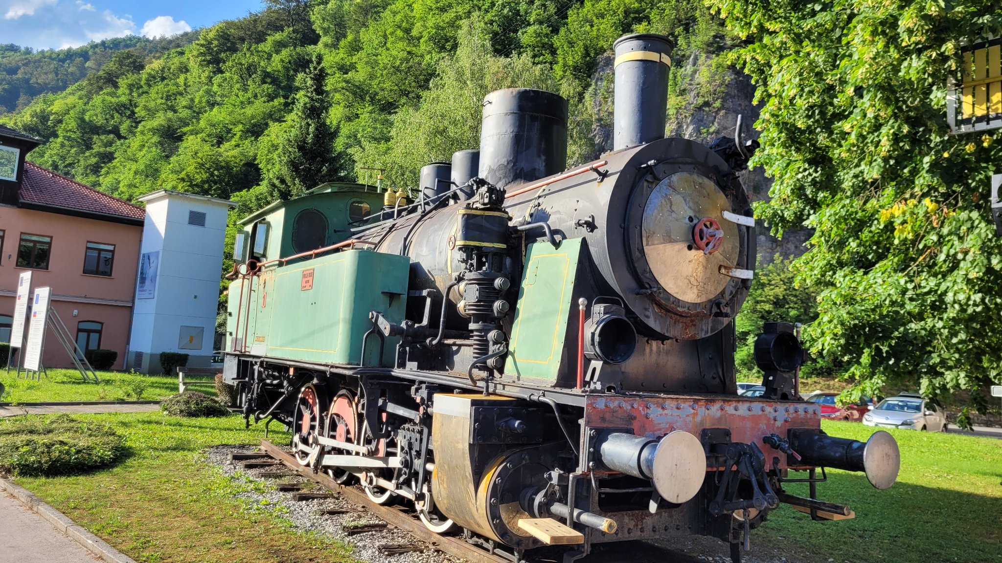Normalnotirna parna lokomotiva SH-1 na železniški postaji v Zidanem Mostu. Lokomotivo je leta 1913 izdelala nemška tovarna Vulcan-Werke v Stettinu (današnji Szczecin na Poljskem). Tip: Dt-n2, dolžina: 9960 mm, premer pogonskih koles: 1030 mm, premer valjev: 460 mm, gib bata: 540 mm, lastna teža: 37 t, teža v službi: 48 t, osna obremenitev: 12 t, največja hitrost: 40 km/h, moč: pribl. 300 kW (400KM)"