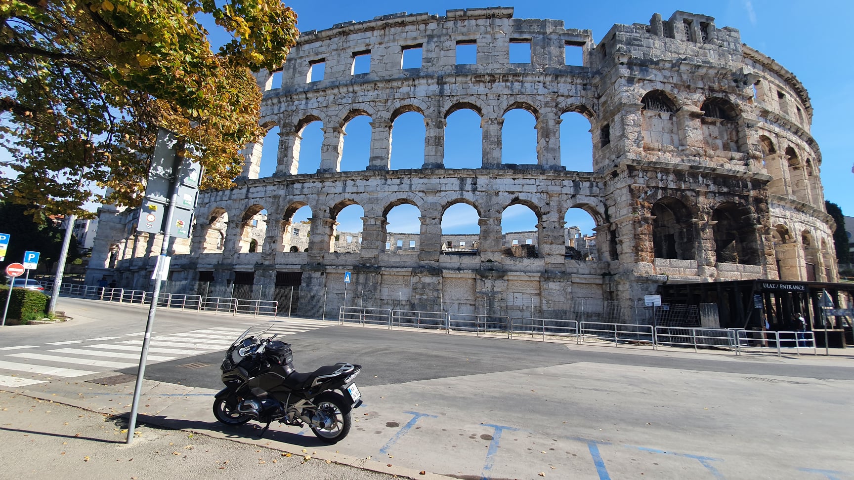 Jesenski odklop na Plominki in ogled koloseja v Puli. 22. stopinj v Puli, kar je idealna temperatura za motor.