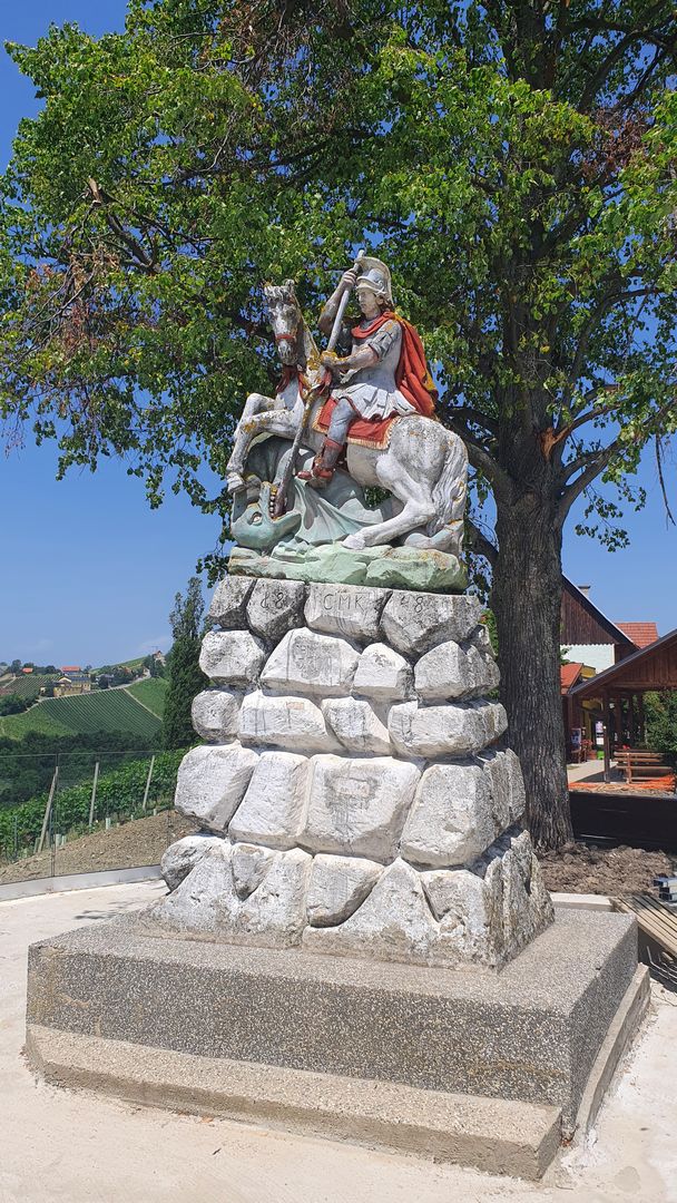 Kip sv. Jurija v borbi z zmajem. Kamnito znamenje je redek primer figuralnega znamenja s to temo. Datirano je v sredo 19. stol. in ima lepo lego med vinogradi.