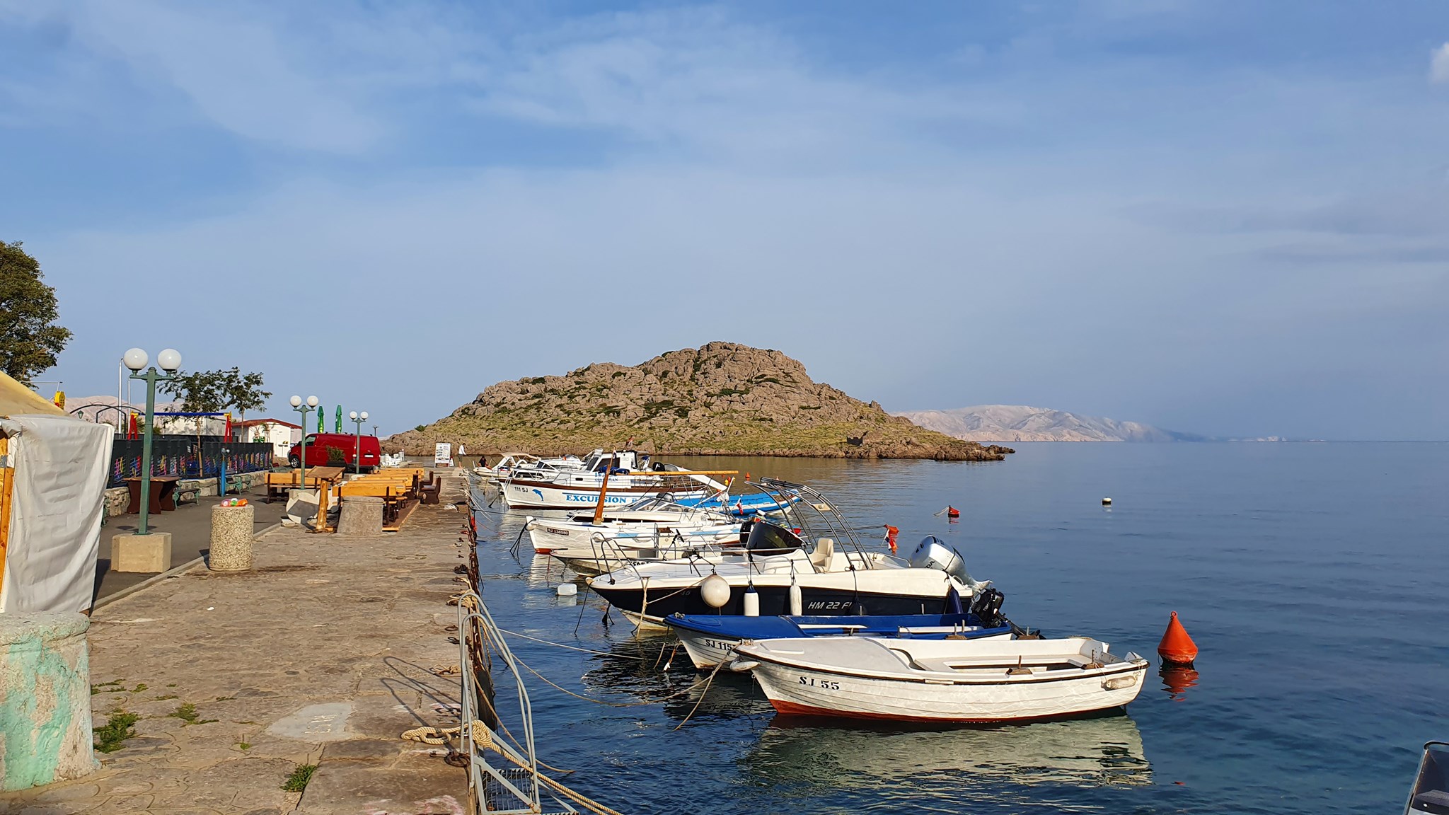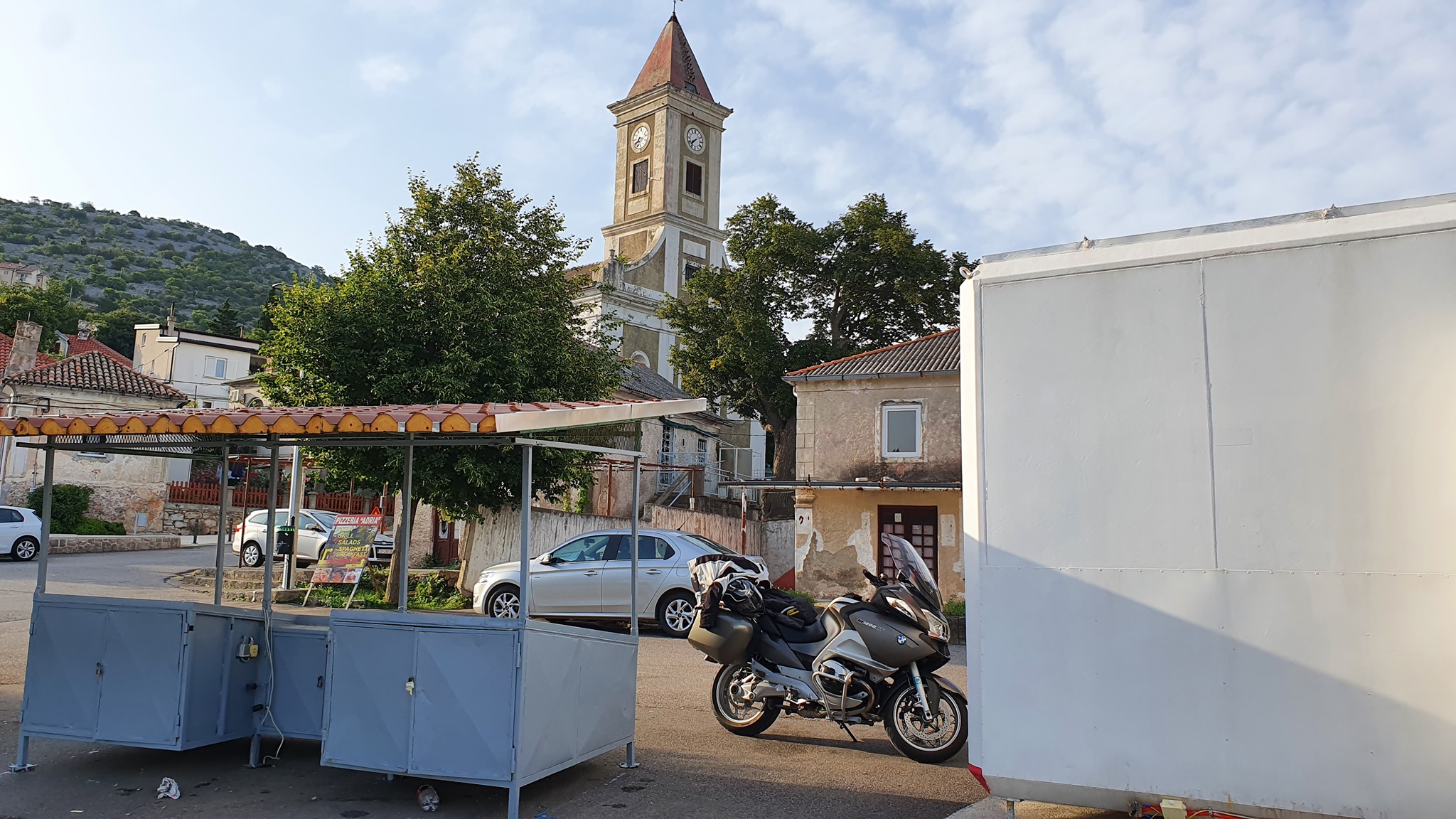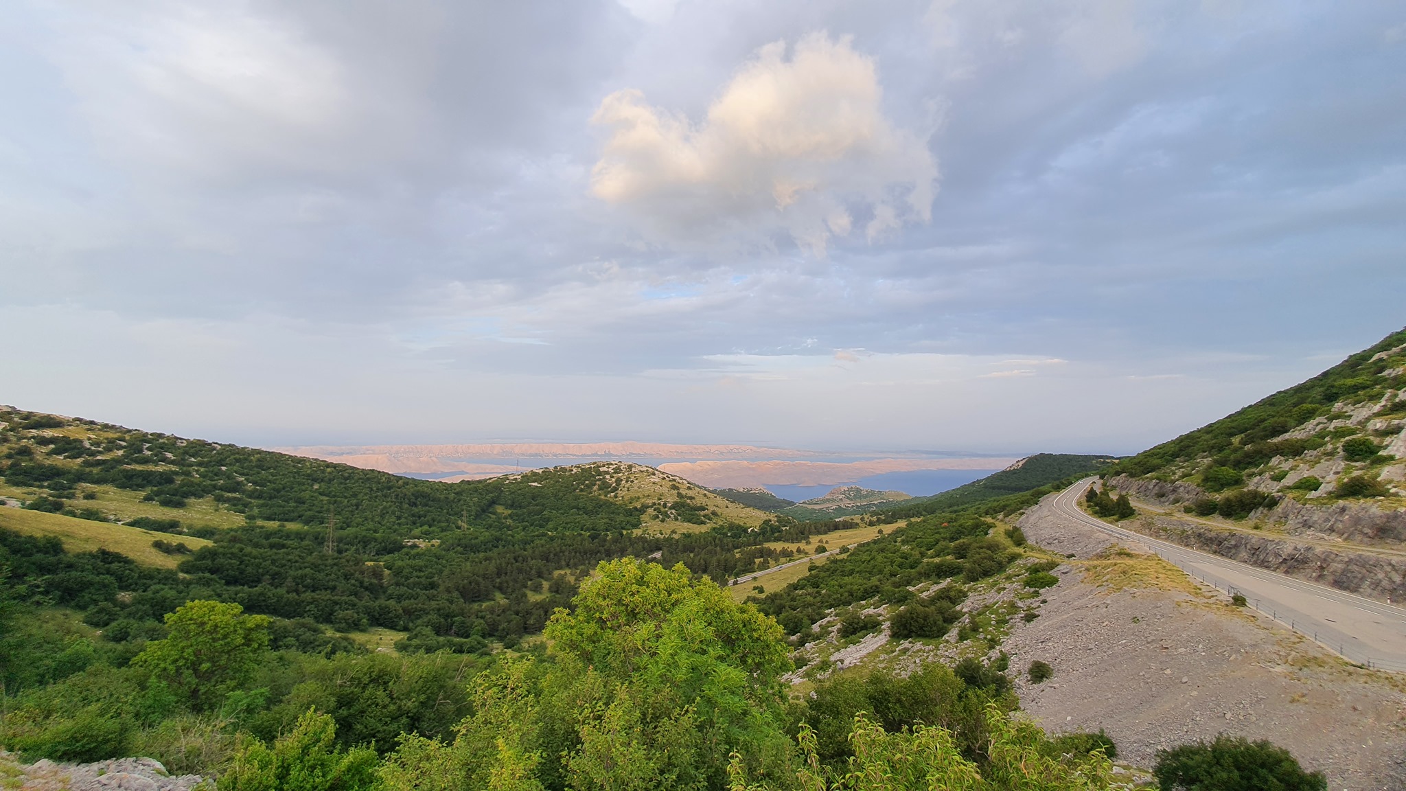 Karlobag, budilka zvoni ob 5:00. Pospraviva apartma, popijeva kavo in na bližnji črpalki dotočiva gorivo. Začneva se vzpenjati po lepi gorski cesti na Velebit, ki vodi proti Gospiču. Cesta že od začetka ponuja lepe poglede na celoten otok Pag, Karlobag in zaliv med Pagom in celino. Nekje po 16 km prispeva do obeležja Kubus, ki je bil postavljen kot spomin na gradnjo ceste Karlobag Gospič. Ravno ob pravem času prispeva po stopnicah do kocke, ko začne sonce sijati in preganjati sence iz otoka Pag. Ker sva bila ta dan namenjena proti Umagu, se po isti poti vrneva na Jadranko in peljeva proti Rijeki. Ustaviva se v Svetem Juriju, kjer si privoščiva rogljiček.