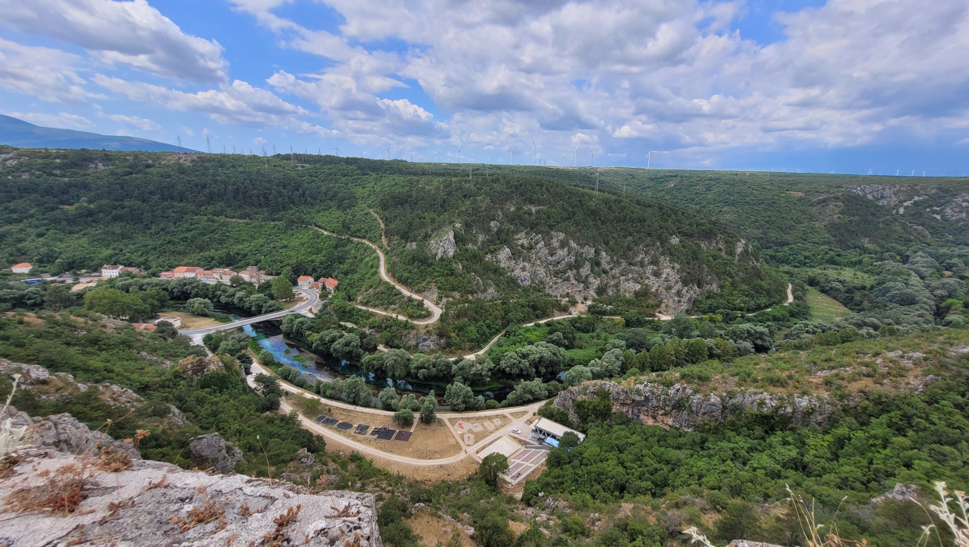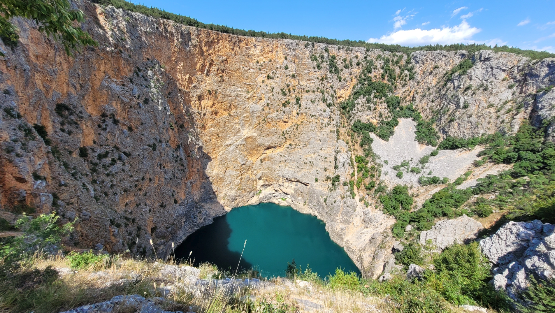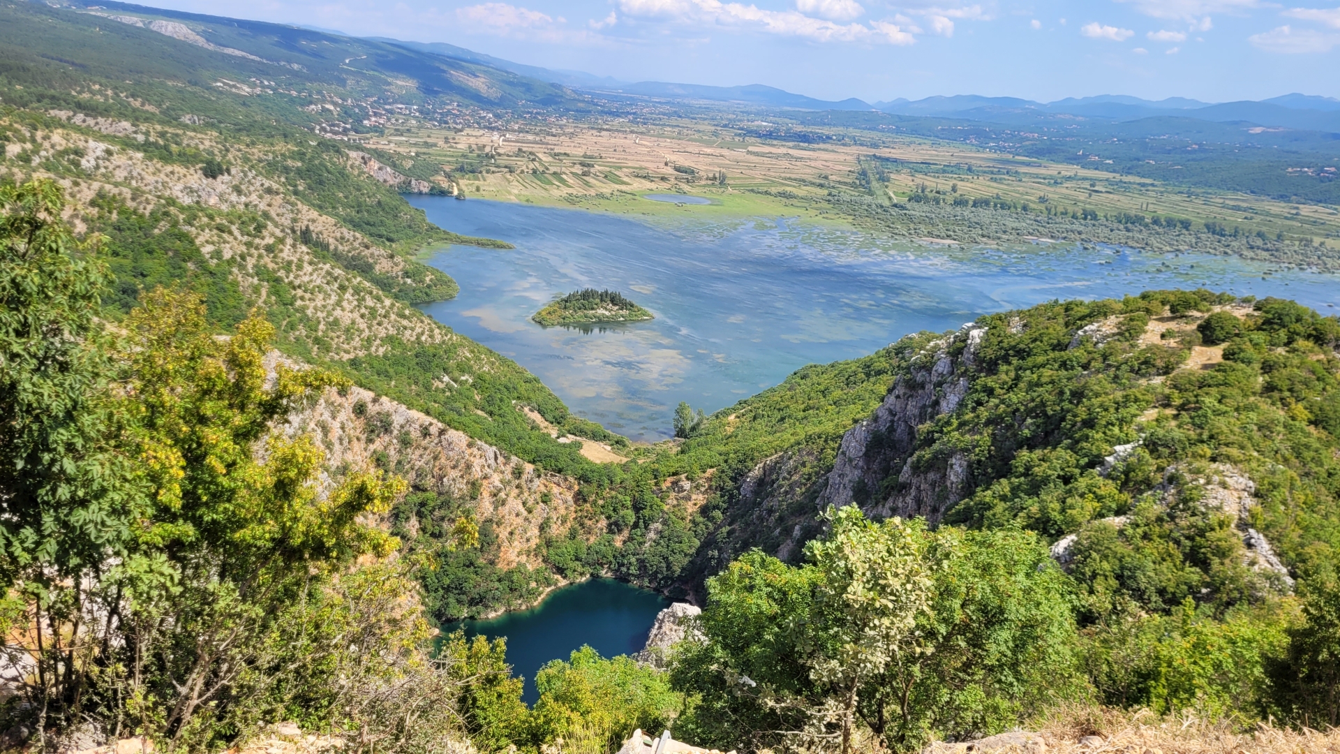 Sobota 29.7. zvečer. Spakirava kufre, pripravim motor, pogledam vremensko napoved in pravim ženi: "Greva spat, jutri morava zgodaj štartat, da prehitiva nevihte, ki se bodo pojavljale že v zgodnjih urah". Nastavim budilko na 3:00 in smuk v posteljo. Še 2x se ne obrnem, že alarm budi. Pogledam skozi okno, glej ga zlomka nevihte napovedane za 5. uro so se začele že ob 3h zjutraj. Zunaj pada, grmi, se bliska. Vržem ženo pokonci in začnem s priganjanjem, da morava hitro štartat in po avtocesti ujeti konec deževja vsaj pri Grosupljem. Zbaševa se v dežjake in šibneva na avtocesto. "Boš videla, kmalu bo nehal padati" in obljubljam suho vreme vsak hip. V Grosupljem naju še vedno pere. V Novem mestu na pumpi se ustaviva, zlijem vodo iz desnega čevlja. Samo v desnem mi je teklo notri, saj imam malo prekratke dežne hlače in ob menjanju mi hlačnica zdrsne navzgor. Tako je lilo, kot da bi se utrgal oblak. Preverim radarsko sliko in pravim, da če pohitiva, ujameva v Karlovcu suho vreme. Drviva čez Gorjance in v Metliki čez mejni prehod. Ni bilo v Karlovcu, niti na Plitviških jezerih, na suho sva prišla šele malo pred Kninom, kjer sva se preoblekla in šla pogledat Kninsko trdnjavo. Na sončku po trdnjavi sva se lepo posušila in malo ogrela. Ampak glej ga hudiča, spet je začelo kapljati. Hitro se zbaševa na motor, tokrat brez dežjakov, saj sem prepričan, da bova dežju ušla. No še enkrat naju je opralo, vendar sva se tokrat so Sinja lepo posušila. Najin današnji cilj je bil Imotski in ogled Prološkega Blata, Rdečega in Modrega jezera. V Imotskem sva v apartmaju obesila obleke na sonce in se peš odpravila do Modrega jezera.